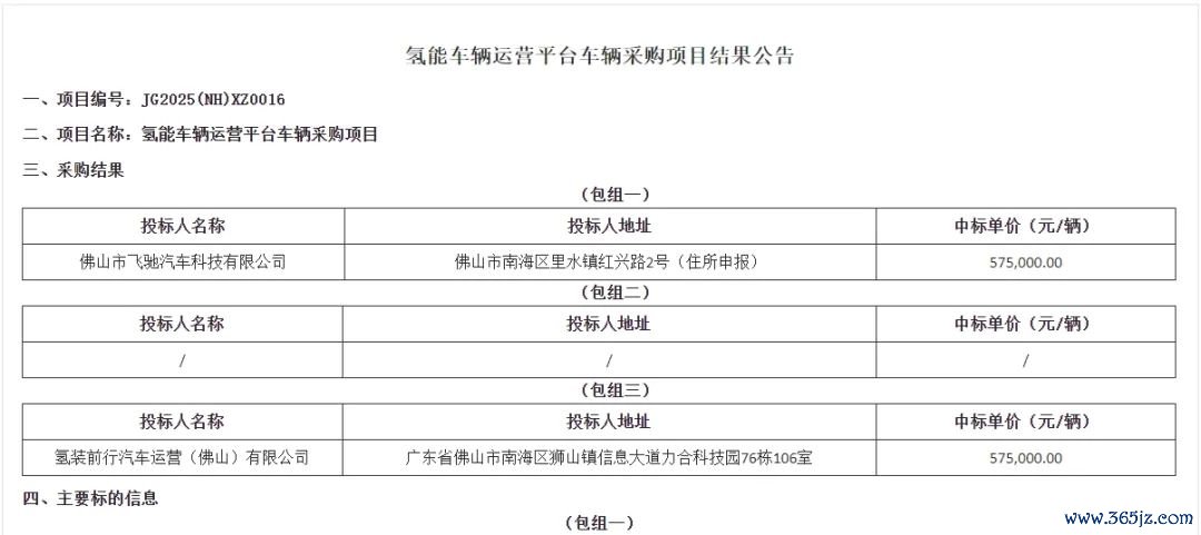 5月15日,佛山市公共资源交易平台发布1000辆氢能车辆运营平台车辆采购项目结果公告,共分为三个包组。其中,包组一采购500辆轻型燃料电池冷藏车,中标候选人为佛山市飞驰汽车科技有限公司,中标单价为57.5万元/辆,中标金额为2.875亿元。包组二采购300辆轻型燃料电池冷藏车,已废标。包组三采购200辆轻型燃料电池冷藏车,中标候选人为氢装前行汽车运营(佛山)有限公司,中标单价为57.5万元/辆,中标金额为1.15亿元。