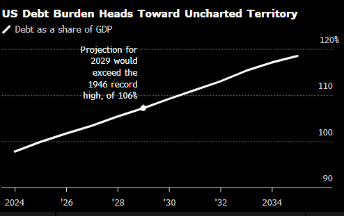 周三30年期美债收益率再度突破5%,而此前一周,第三家评级机构下调了美国主权信用评级,预测美国债务将在未来十年内从目前约占GDP的100%跃升至134%。